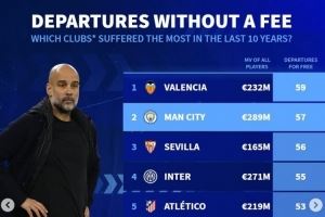 五大联赛近10年免签离队:曼城57人 国米55人 巴萨50人 米兰49人